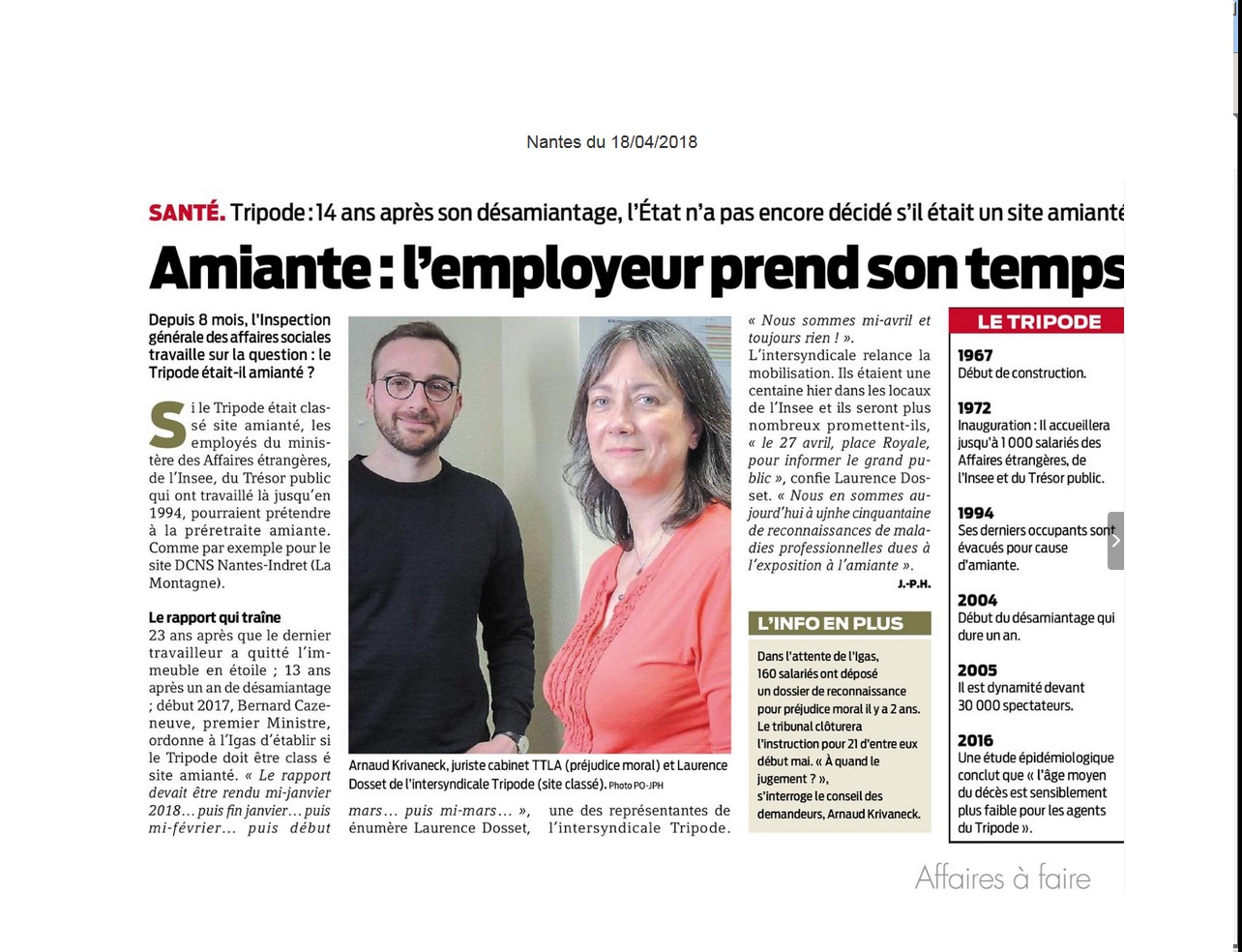 Depuis huit mois, les salariés qui ont travaillé jusqu'en 1994 dans le bâtiment Tripode, sont dans l'attente de la décision de l'Inspection Générale des Affaires Sociale (IGAS) de classer cet établissement parmi les sites amiantés ouvrant droit à une cessation anticipée d'activité.