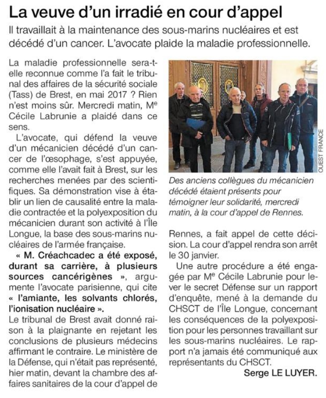 Au cours de l'audience qui s'est déroulée le 12 décembre 2018 devant la cour d'appel de RENNES, l'épouse d'un ancien ouvrier d’État, décédé des suites d'un cancer de l’œsophage,