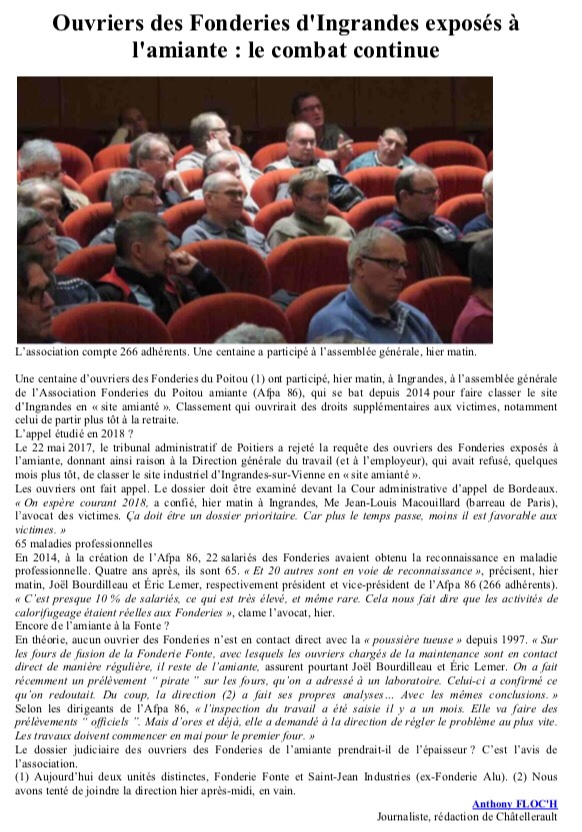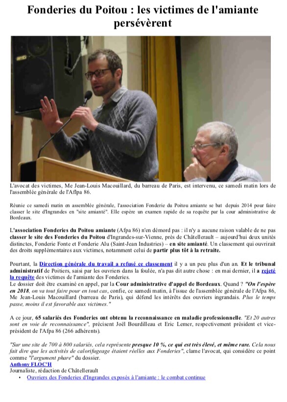 L'association Fonderie du Poitou Amiante (AFPA 86) s'est réunie lors de l'assemblée générale qui s'est tenue samedi 27 janvier 2018, en présence de Me Jean-Louis Macouillard.