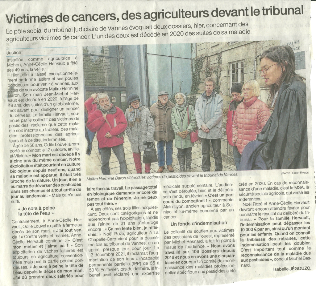 Deux affaires concernant des agriculteurs victimes de cancer ont été plaidés par Maître Hermine Baron du Cabinet d'avocats TTLA & associés le 5 décembre 2022, devant le pôle social du tribunal judiciaire de Vannes.