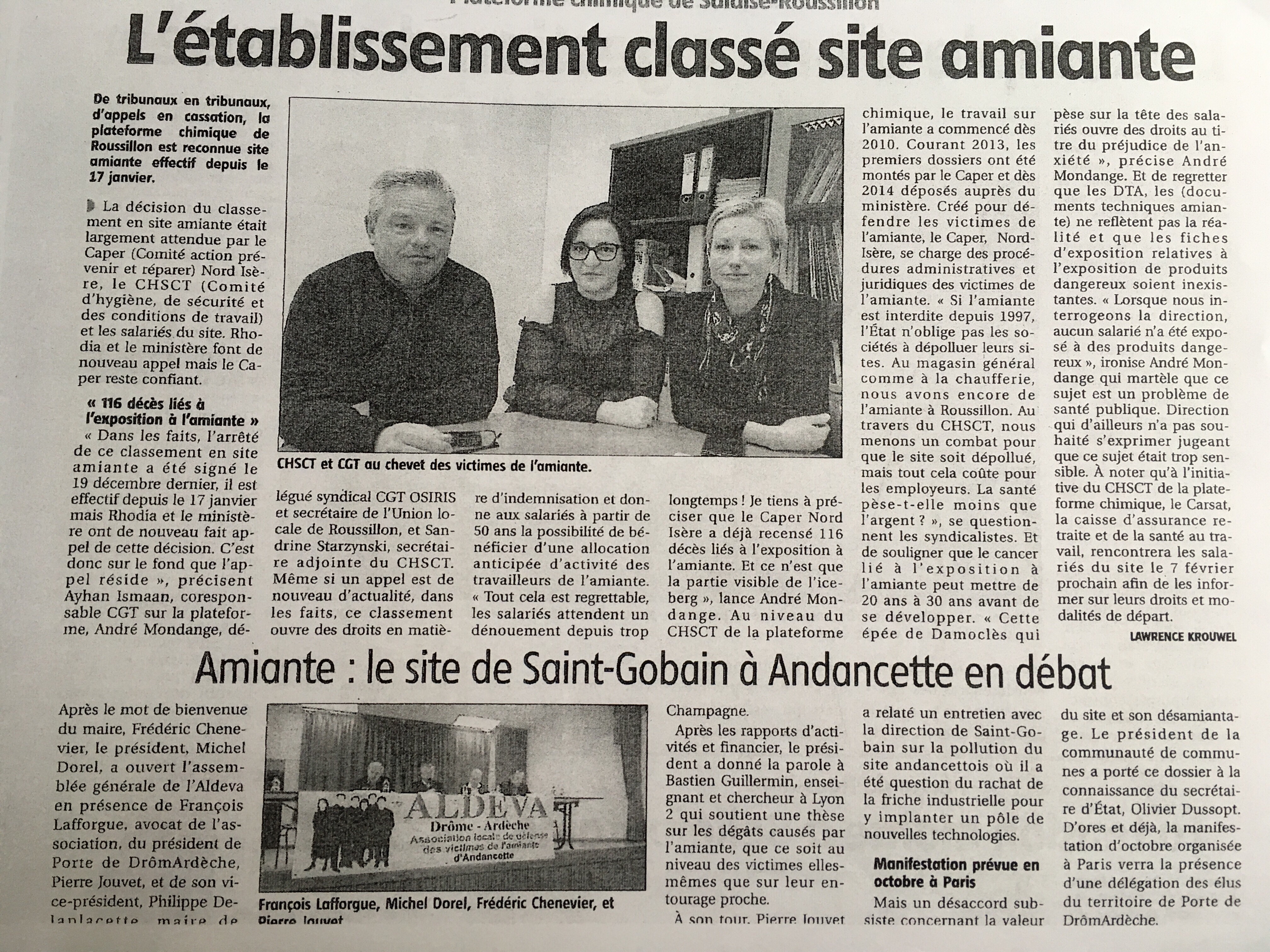 Par arrêté du 19 décembre 2017, l'entreprise Rhodia, site de Salaise-Roussillon, est inscrite sur la liste des établissements ouvrant droit à une cessation anticipée d'activité des travailleurs de l'amiante.