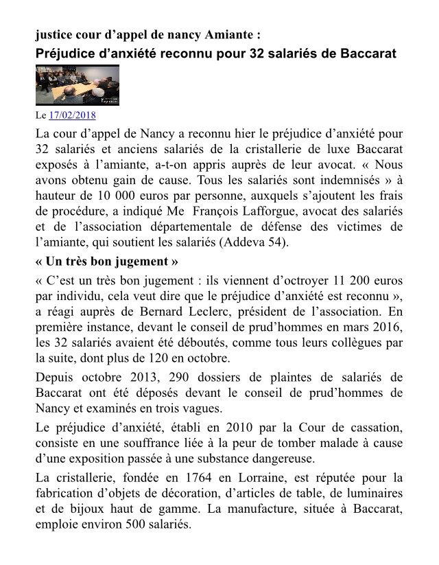 Par décision de 16 février 2017, la cour d’appel de Nancy a condamné la cristallerie de luxe Baccarat à verser à 32 salariés et anciens salariés exposés à l’amiante, la somme de 10000 euros au titre de la réparation de leur préjudice d’anxiété.